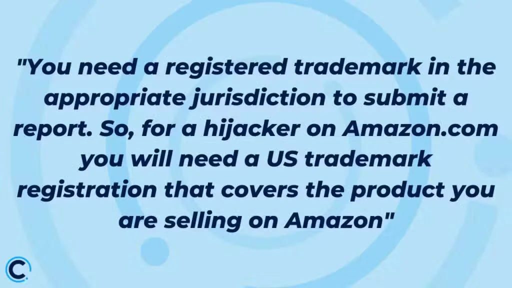 - For hijackers on Amazon.com, you need a US trademark registration that covers the product you are selling